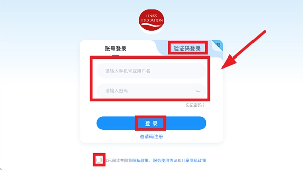进入登录界面后,输入手机号或用户名,密码,勾选我已阅读并同意隐私政策、服务使用协议和儿童隐私政策,点击登录即可,还可以点击验证码登录,使用手机验证码登录