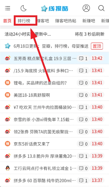 安装并打开线报酷,进入首页后点击如图排行榜按钮
