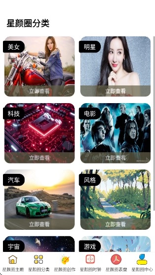 星颜圈是一款精致的手机壁纸应用,在这儿,你能发现大量高清手机壁纸。无论是动漫明星、美食美景,还是汽车美女,各种类型海量丰富,一应俱全。不仅如此,你还能找到许多精美的天气、时间等趣味小软件。在这里,你更可以尽情施展创意,通过亲手涂鸦制作壁纸,打造专属且独一无二的手机桌面。