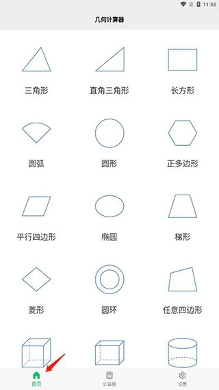 1、打开软件,在首页可以看到有各种几何图形,比如三角形、直角三角形、长方形、圆形、梯形、圆环等等;