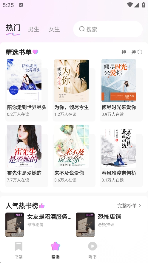 1、精选页面上存在大量热门小说,主要涵盖精选书单与人气热书榜。