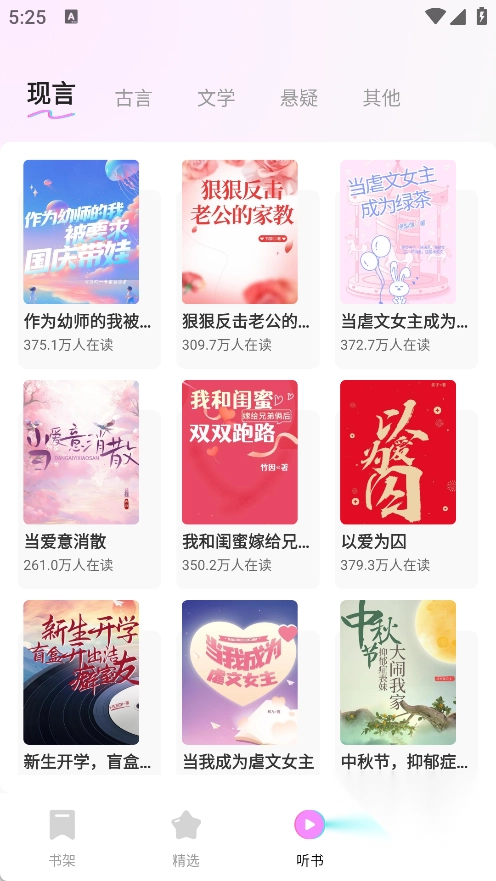 2、在听书页面中包括了非常多不同的类型,让你选择喜欢类型后,找到喜欢小说进行听书。