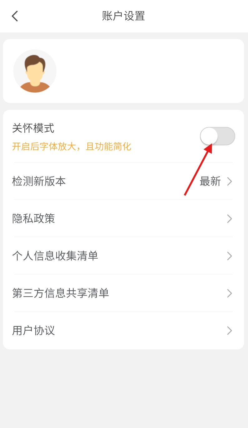 3、在账户设置页面中,找到 “关怀模式” 选项,点击其旁开关,即可开启关怀模式。