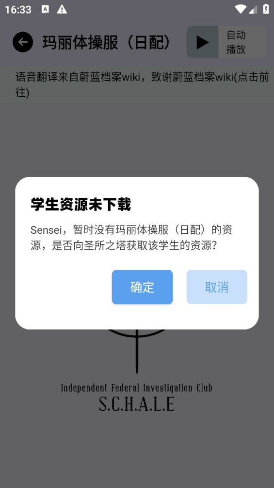 4、点击角色名称后进入语音界面,弹出提示需要语音资源,点击【确定】即可